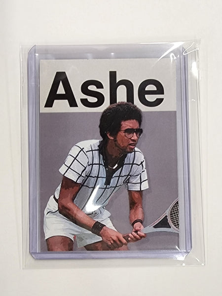 The card features a beautifully detailed depiction of Arthur Ashe in action. The artist's meticulous attention to detail and vibrant color palette make this card a treasure for any serious Tennis sports card collector or fan of Arthur Ashe.