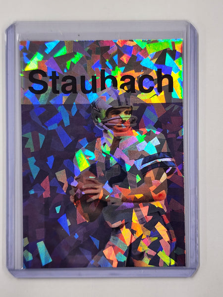 The card features a beautifully detailed depiction of Roger Staubach in action. The artist's meticulous attention to detail and vibrant color palette laid over the holographic refractor pattern make this card a treasure for any serious Dallas Cowboys sports card collector or fan of Roger Staubach.