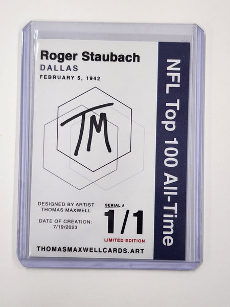 We’re excited to offer this exclusive Roger Staubach Limited Edition Refractor Art Card. This unique Dallas Cowboys Art Card numbered 1/1, showcases Roger Staubach and is hand-signed by the artist and affixed with a numbered hologram adding an extra layer of authenticity.