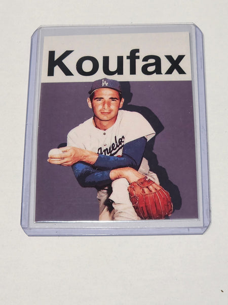 The card features a beautifully detailed depiction of Sandy Koufax in action. The artist's meticulous attention to detail and vibrant color palette make this card a treasure for any serious Baseball sports card collector or fan of Sandy Koufax.