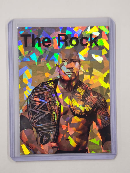 The card features a beautifully detailed depiction of The Rock in action. The artist's meticulous attention to detail and vibrant color palette laid over the holographic refractor pattern make this card a treasure for any serious Wrestling sports card collector or fan of The Rock.