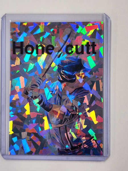 The card features a beautifully detailed depiction of Vance Honeycutt in action. The artist's meticulous attention to detail and vibrant color palette laid over the holographic refractor pattern make this card a treasure for any serious North Carolina sports card collector or fan of Vance Honeycutt.