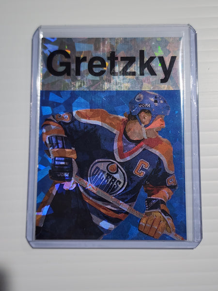 The card features a beautifully detailed depiction of Wayne Gretzky in action. The artist's meticulous attention to detail and vibrant color palette laid over the holographic refractor pattern make this card a treasure for any serious Hockey sports card collector or fan of Wayne Gretzky.